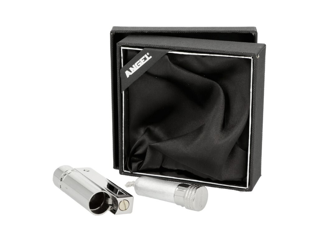 Stylový benzínový zapalovač Angel Austria Chrome. Kovový kamínkový zapalovač rakušák v chromovém lesklém provedení a texturovaným povrchem. Stisknutím a odklopením horního krytu zapalovače škrtneme kamínkem a plamen se zapálí. Ve spodní části zapalovače najdeme vysunovací zásobník s vatou pro absorbování benzínu. Benzínový retro zapalovač je dodávaný nenaplněný v dárkové krabičce.