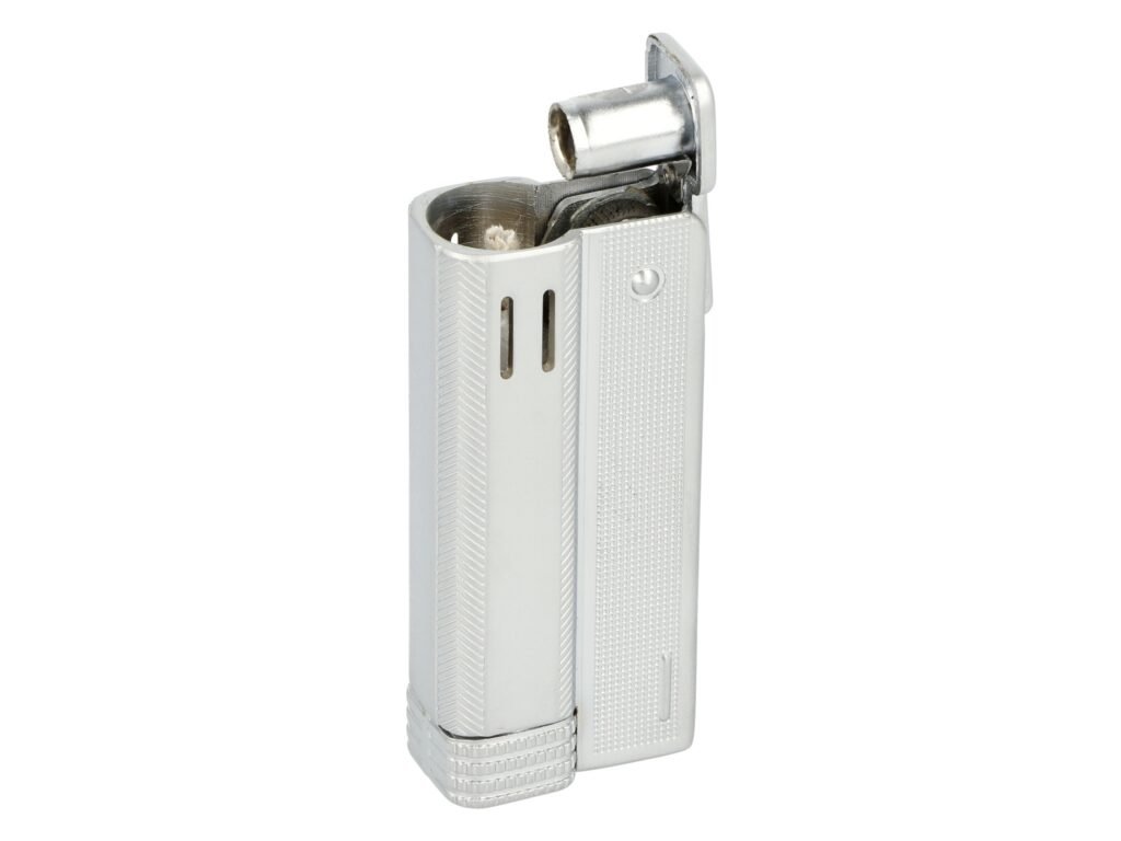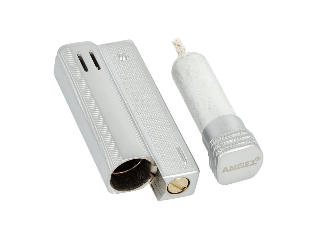 Stylový benzínový zapalovač Angel Austria Silver. Kovový kamínkový zapalovač rakušák ve stříbrném polomatném provedení a texturovaným povrchem. Stisknutím a odklopením horního krytu zapalovače škrtneme kamínkem a plamen se zapálí. Ve spodní části zapalovače najdeme vysunovací zásobník s vatou pro absorbování benzínu. Benzínový retro zapalovač je dodávaný nenaplněný v dárkové krabičce.