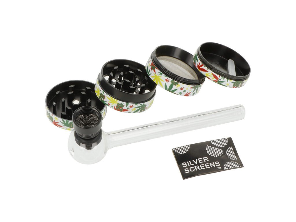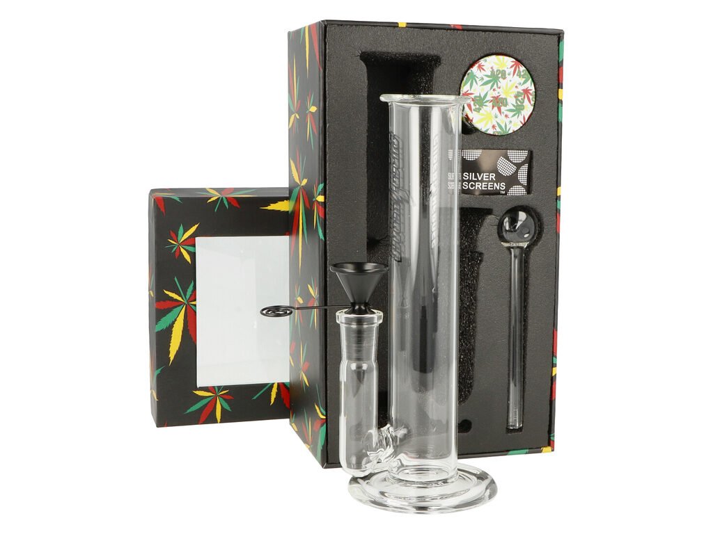 Dárkový set - skleněný bong se šlukovkou, drtičkou konopí a sítky. Praktická dárková sada Super Heroes Giftset Leaf obsahuje kuřácké potřeby, které nejednomu kuřákovi udělají radost. V sadě najdete malý skleněný rovný bong z borosilikátového skla s vestavěným chillumem a kovovým kotlíkem, čtyřdílnou kovovou drtičku, skleněnou dýmku - šlukovku s odnímatelným kovovým kotlíkem a sítka. Vše je dodávané v dárkovém boxu.