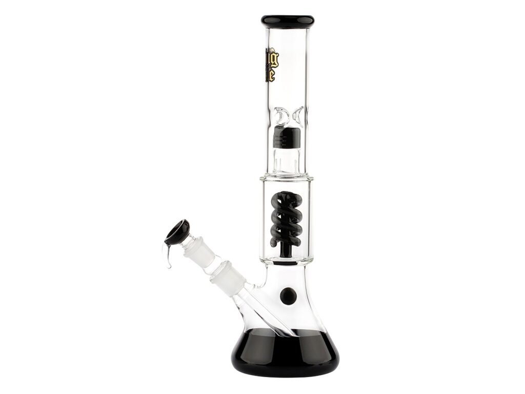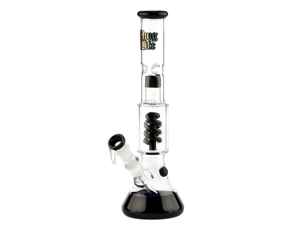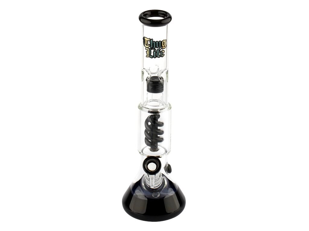 Skleněný bong s perkolací OG Series V2 Black Thug Life. Transparentní bong v černém tónu je na čelní straně zdobený černozlatým nápisem Thug Life. Ice bong ukončený silnějším hrdlem je vybavený "výstupky" pro udržení kostek ledu k ochlazení kouře a spirálovou perkolací, která kouř zjemní. Splashguard ve tvaru kopule zabraňuje nasátí vody do úst. Oproti standardním bongům je tento prémiový bong vyrobený z tepelně odolného borosilikátového skla tloušťky 5 mm. Dvoudílný chillum je vybavený difuzérem.