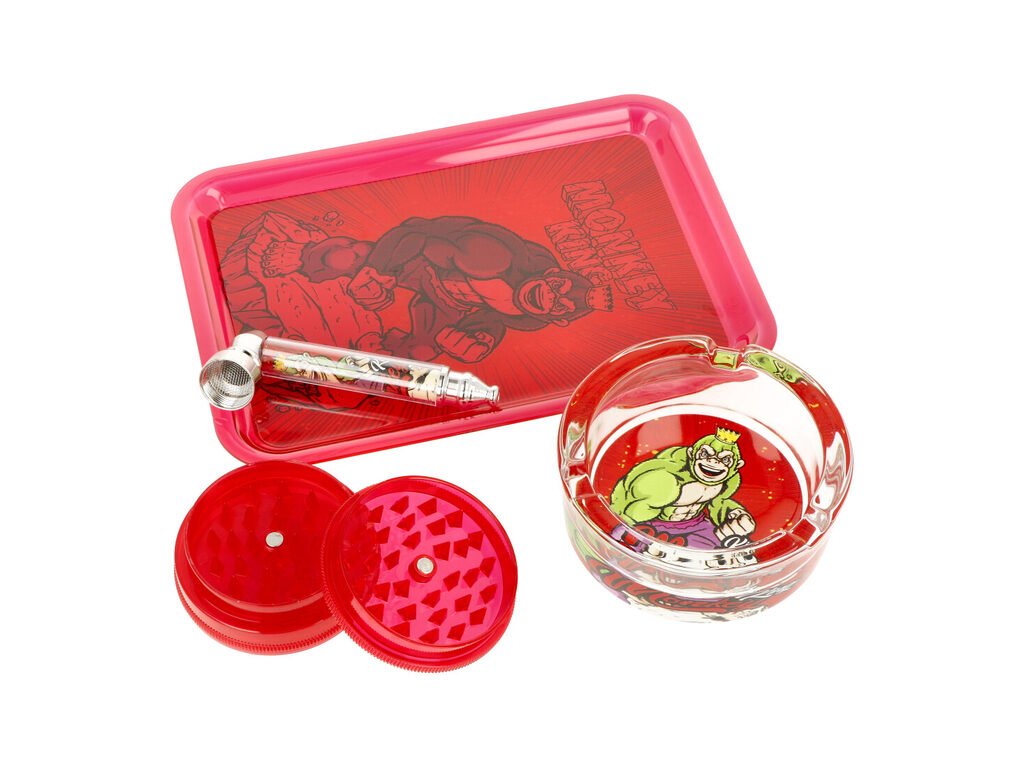 Kuřácká dárková sada Monkey King s drtičkou, šlukovkou a dalšími kuřáckými potřebami. V dárkovém setu nejdete vše, co se může kuřákovi hodit. Obsahem sady v modrém tónu je dvoudílný plastový drtič, rozkládací kovová šlukovka se sítkem, skleněný popelník a plastový tácek - podložka pro balení cigaret. Praktický kuřácký set vhodný jako dárek pro vaše přátelé. Sada je dodávaná v dárkové krabici.
