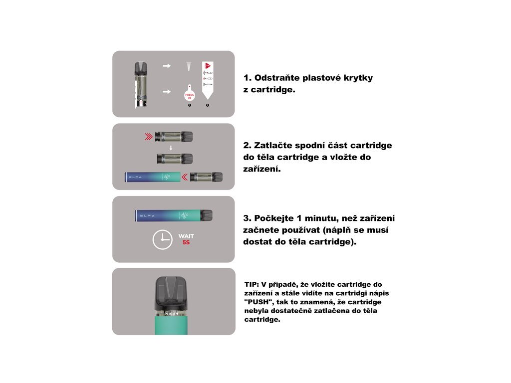 - Počkejte 1 minutu, než zařízení začnete používat (náplň se musí dostat do těla cartridge).